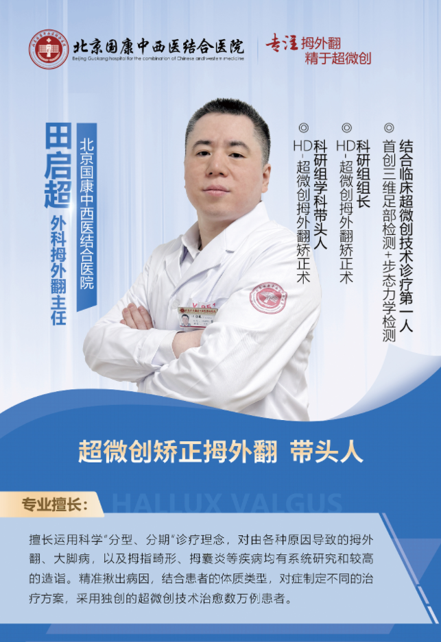 田启超医生:专业正规的拇外翻手术是不会留有后遗症的,为了规避后遗症,做拇外翻手术之前,一定要认真科学的评估病情,确认拇外翻的具体类型,设计合理的矫正方式,全程微创操作,术后也要遵循专业的康复方式,一般来说,小切口拇外翻手术,术后即可行走,经过一个月时间的恢复,就达到临床愈合标准了,就恢复正常工作生活了。
