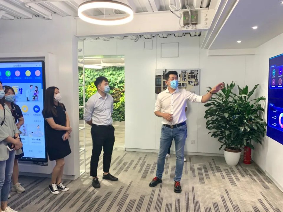 参观过程中,实地集团代表团一行首先通过大屏视频监控看到了家有健康(JoyHealth)四地门诊的实时现场情况,张鹏先生介绍到,和传统基层社区门诊相比,家有健康(JoyHealth)智能连锁门诊以互联网为依托,运用大数据、人工智能等先进技术手段,对门诊的服务体验、营运流程进行再造。在家有健康的整体布局中,分别以人、家庭、社区、商圈等不同应用层级为划分,设计了系列服务场景。在人的维度,研发了SOS智能手环及项链;在家的维度,布局了智能家庭医生;在社区维度,设立有家有健康的实体门诊;在商圈维度,则投放了智能微诊室及急救巡诊车。家有健康智慧医疗体系打破门诊服务边界,线上线下融合惠及每一位社区居民。